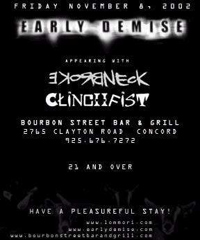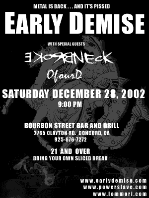 Despite pouring rains and an outbreak of pneumonia among both band and crew, Early Demise played a tight show at Bourbon Street, opening with "Early Demise." Thanks to those who came out and cheers to Suburban Paranoia for providing some kick-ass metal!