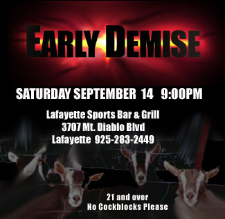 Early Demise had their first show at the Depot in Concord with Sacramento mates G.L.U.G. Opening with Sonic Detonator, the band rampaged the drunken crowd of mostly friends and family. The venue no longer exists.